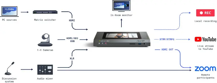 Video integration: Two to four cameras, plus PC inputs (minutes, agendas, presentations) via matrix switchers, all into Pearl.