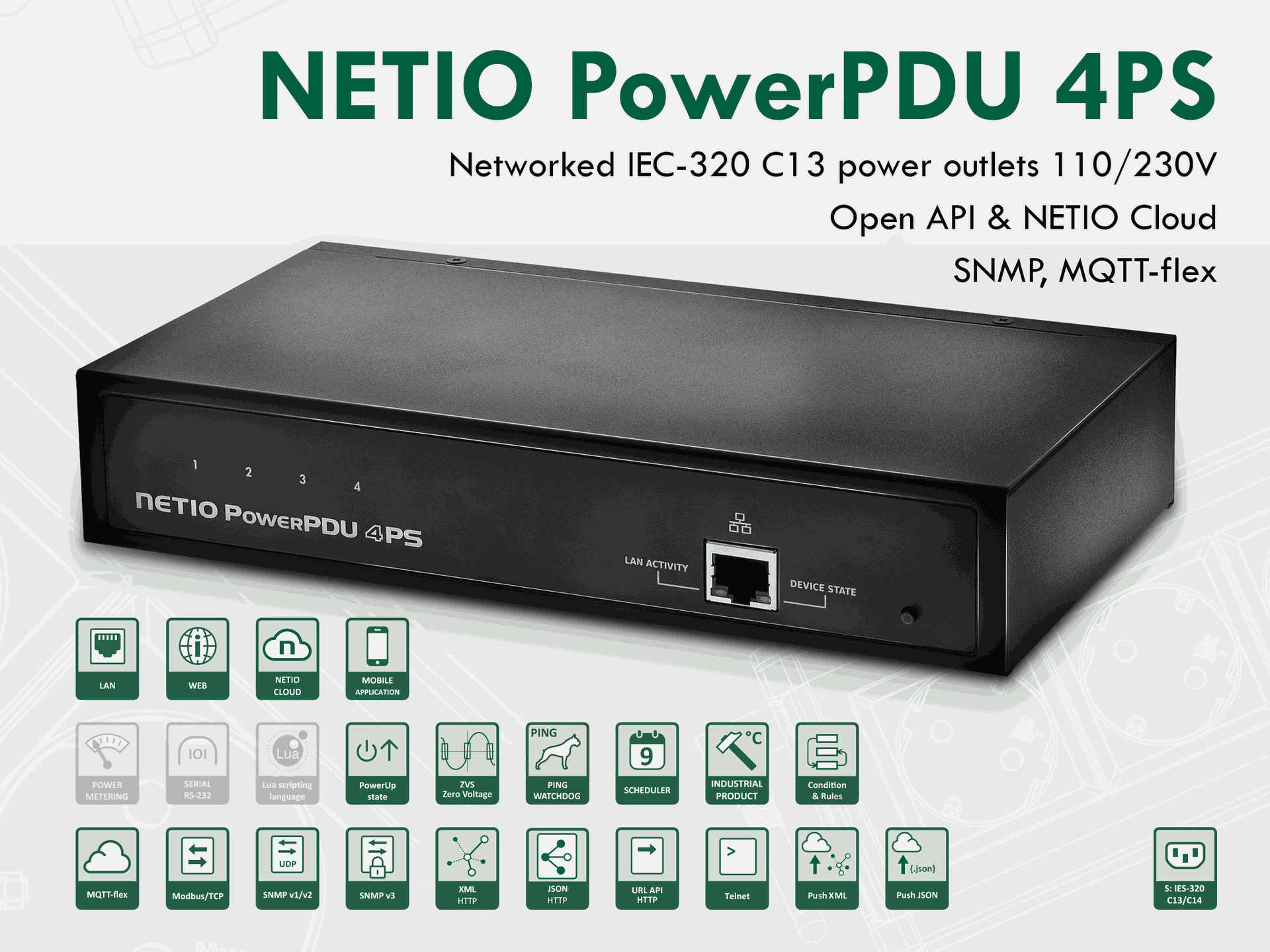 NETIO PowerPDU 4KS is a smart PDU (Power Distribution Unit) with 4 metered & switched power outputs (4x IEC-320 C13) and 1x DI (Digital Input). PDU measures power consumption (A, kWh, TPF, W, V, Hz) and switching On/Off each power output individually. Device supports local Ping & Power WatchDog and Scheduler functions.