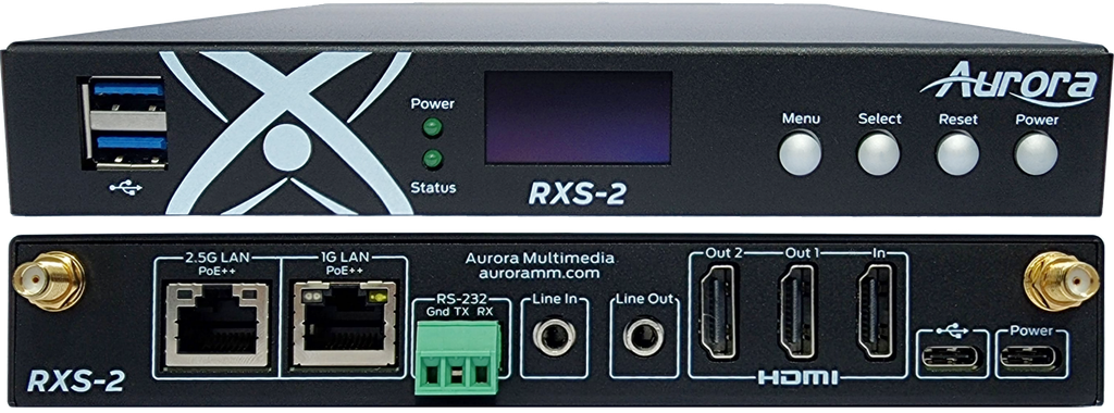 The Aurora RXS-2 is a 12th Generation Intel NUC Element PC designed for the AV industry and more. Its small size allows for mounting behind displays and under tables. It can also be rack mounted as two in a 1RU or 12 in 5RU. Available in i5 & i7 with 1TB SSD. The RXS-2 has dual 4K60 4:4:4 HDMI outputs and one HDMI input for capture of 4K signals. Wi-Fi 6e, Bluetooth, 2.5G LAN, 1G LAN, USB 3.1, and RS-232 ports make it perfect for unified communications and digital signage applications. Sometimes it is the little things that make a big difference and that is where the OLED comes in. The front OLED will display IP address, MAC address, serial number, and more which is great for servicing. Finally, a PC made to simplify installations with a powerful processor and features beyond a typical PC.
